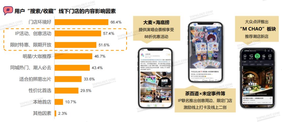 从内容对用户消费决策的影响来看,联名互动、特惠福利相关内容吸睛,促使用户进一步关注门店。克劳锐的线上调研数据显示,约有57.4%的调研用户会被IP活动、创意活动吸引,51.6%的调研用户更加关注限时特惠、限期开放等信息。