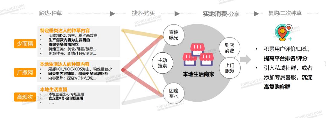 整体来看,爆款内容引流+本地生活达人内容铺量+高频次直播带货成为了常态化营销组合。 从「触达种草」、「搜索购买」,到「实地消费」,再到「复购」,一个完整的本地生活营销链路逐渐形成。