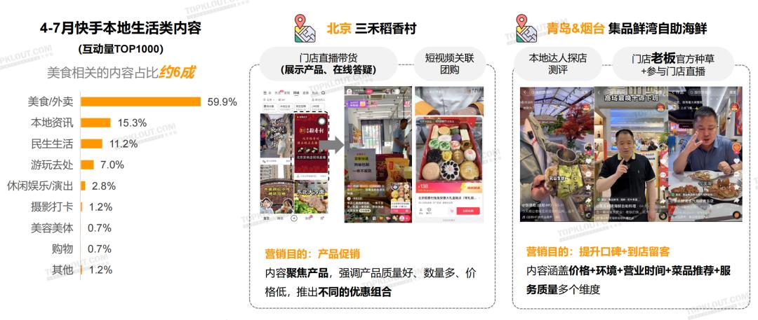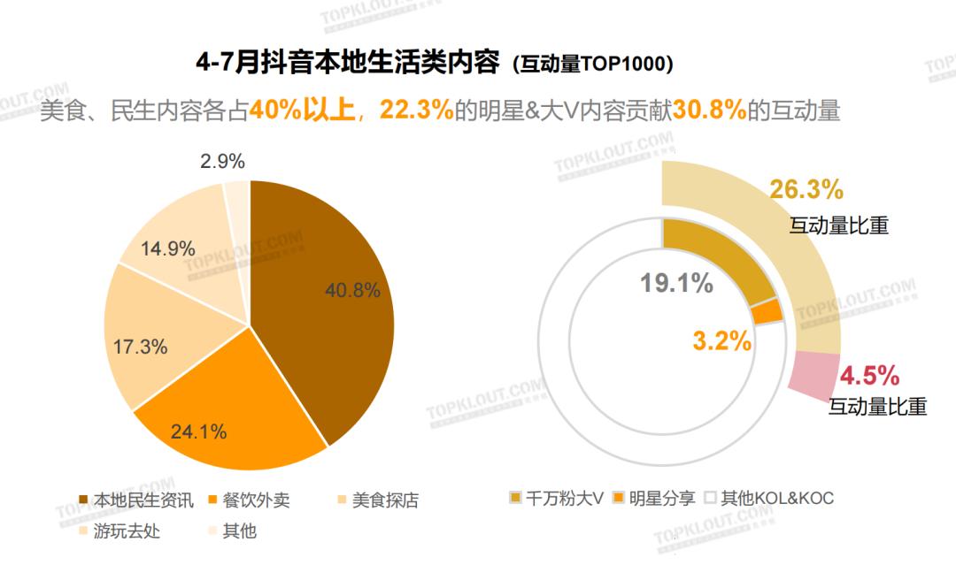 根据克劳锐的数据,4—7月的抖音本地生活互动量TOP1000的内容中,美食、民生内容各占40%以上,明星与大V内容占比为22.3%,并贡献了30.8%的互动量。大V、明星在线下打卡、探店、测评内容覆盖大量用户互动,是抖音城市线下生活服务类种草内容的主力。