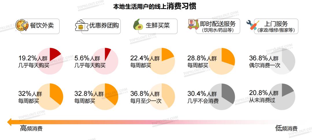 根据克劳锐的用户调研结果,点外卖、团券、买菜是本地生活用户最主要的线上消费类型。在同一平台进行内容消费和产品消费的用户占比更高,本地生活的在线消费决策链路更短。