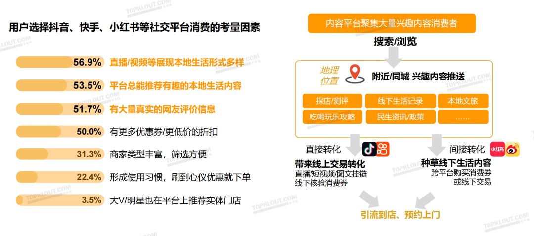 相较之下,「内容丰富真实」是用户选择内容平台进行本地生活消费的关键。内容平台聚集大量兴趣内容消费者,一方面,在直播、短视频、图文进行挂链,再到线下核验消费券的形式更易促成对用户的直接转化,另一方面,通过线上内容种草,能够推动用户跨平台购买消费券或线下交易。