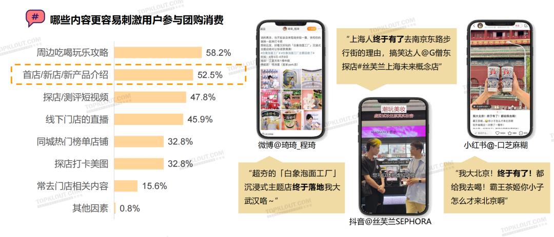 同 时,52.5%的受访者表示,新品、新店、首店等信息更容易刺激自己参与团购消费,「新鲜感」成为用户下单的重要驱动力。 例如大众点评推出的“M CHAO”板块,通过推荐潮店、新店,吸引了众多年轻用户的关注。