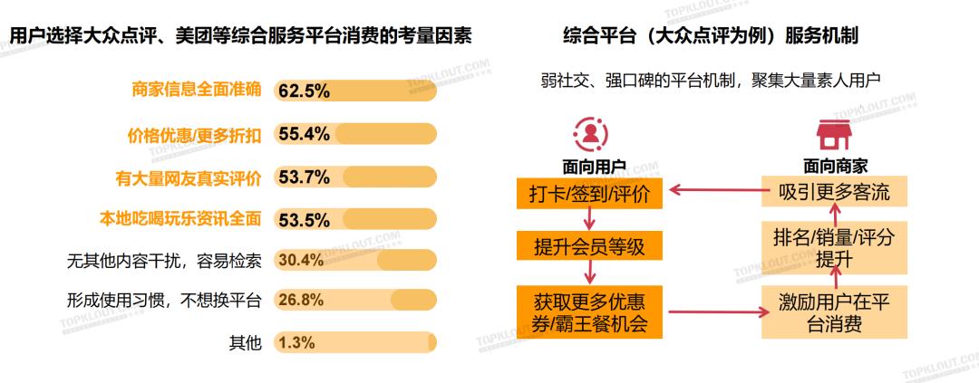 「信息全面客观」是用户选择综合平台进行本地生活消费的关键,弱社交、强口碑的平台机制使得综合平台聚集大量素人用户,全面与真实是用户选择综合服务平台消费的考量因素。