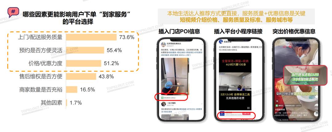 值得一提的是,上门、配送服务质量是影响用户下单“到家服务”的关键因素,用户下单「到家服务」时,预约便捷度与价格因素几乎同等重要。