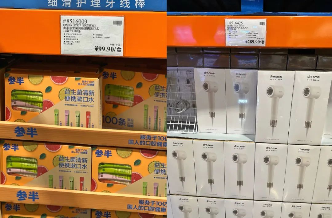 细品发现,与山姆一样,大量的国内新消费品牌也入驻了Costco。比如聚焦智能清洁的追觅、专注口腔护理的参半、主打果蔬饮品的维果清等等。其中,参半在Costco上架的是一款100条的大包装便携装漱口水,四种口味,售价99.9元,平均每支0.99元,在一些线上平台上,参半桃气乌龙单口味20条售价28.9元,平均单条1.4元,略高于Costco。