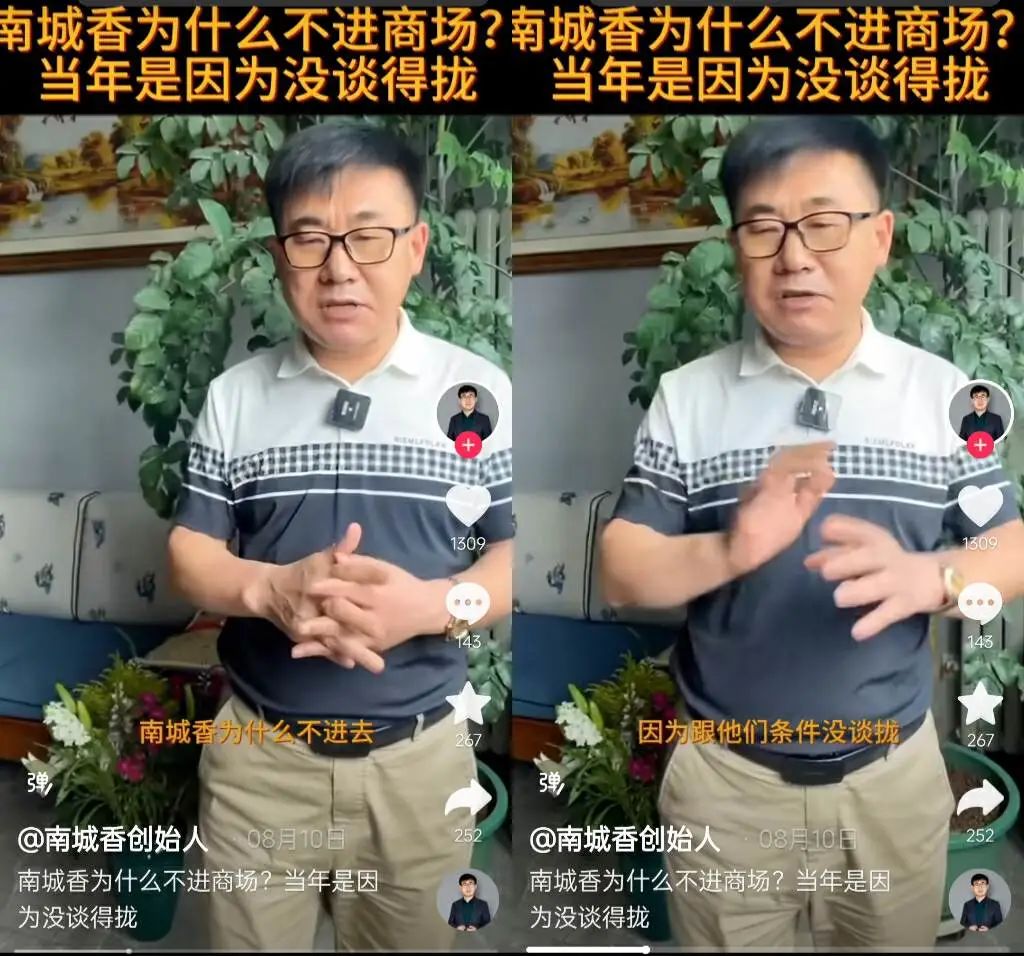 8月10日,南城香创始人汪国玉(@南城香创始人)发短视频,说“南城香为什么不进商场?当年是因为没谈得拢”。