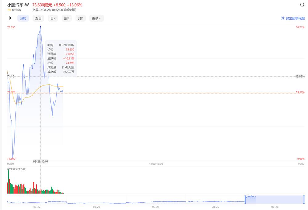 消息传出后,小鹏汽车的港股股价最高上涨了16.21%,截止发稿前,小鹏汽车的股价为73.6港元/股(约合人民币68.34元/股),总市值为1276亿港元(约合人民币1185亿元)。