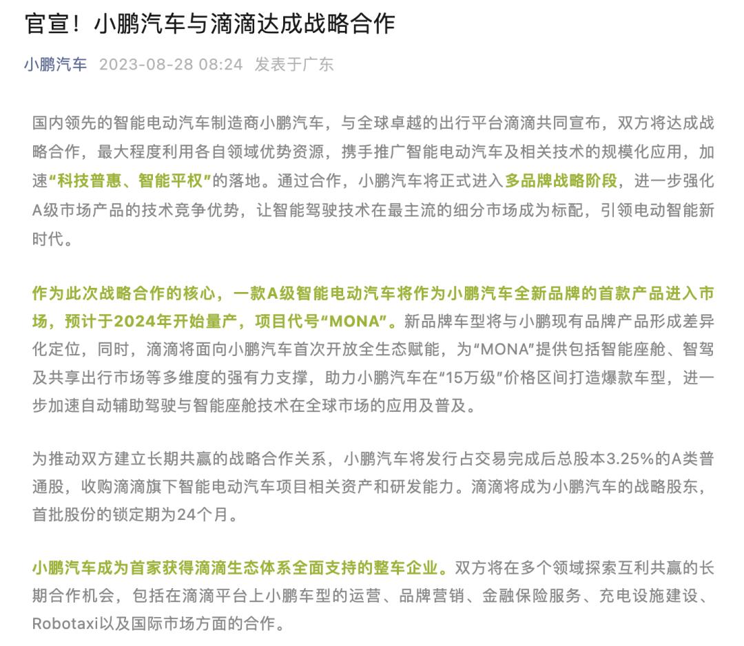 小鹏汽车发布公告官宣与滴滴合作造车