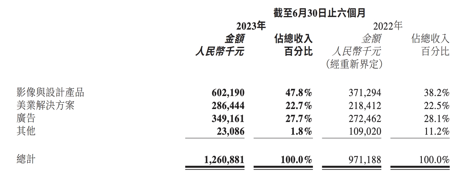 美图公司业务板块重新分类,分为影像与设计产品业务、美业解决方案业务、广告业务以及其他业务四大类。具体调整为:VIP订阅业务、互联网增值服务及SaaS及相关业务项下的若干收入已重新界定并重新分类为影像与设计产品业务;SaaS及相关业务项下的若干收入已重新界定并重新分类为美业解决方案业务;在线广告及互联网增值服务项下的若干收入已重新界定并重新分类为广告业务。