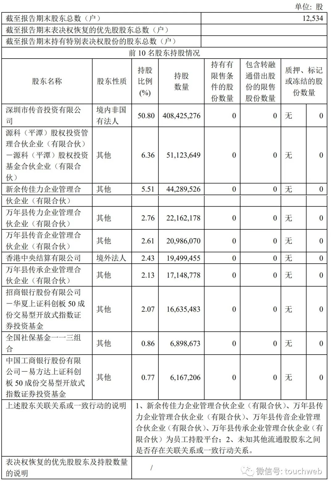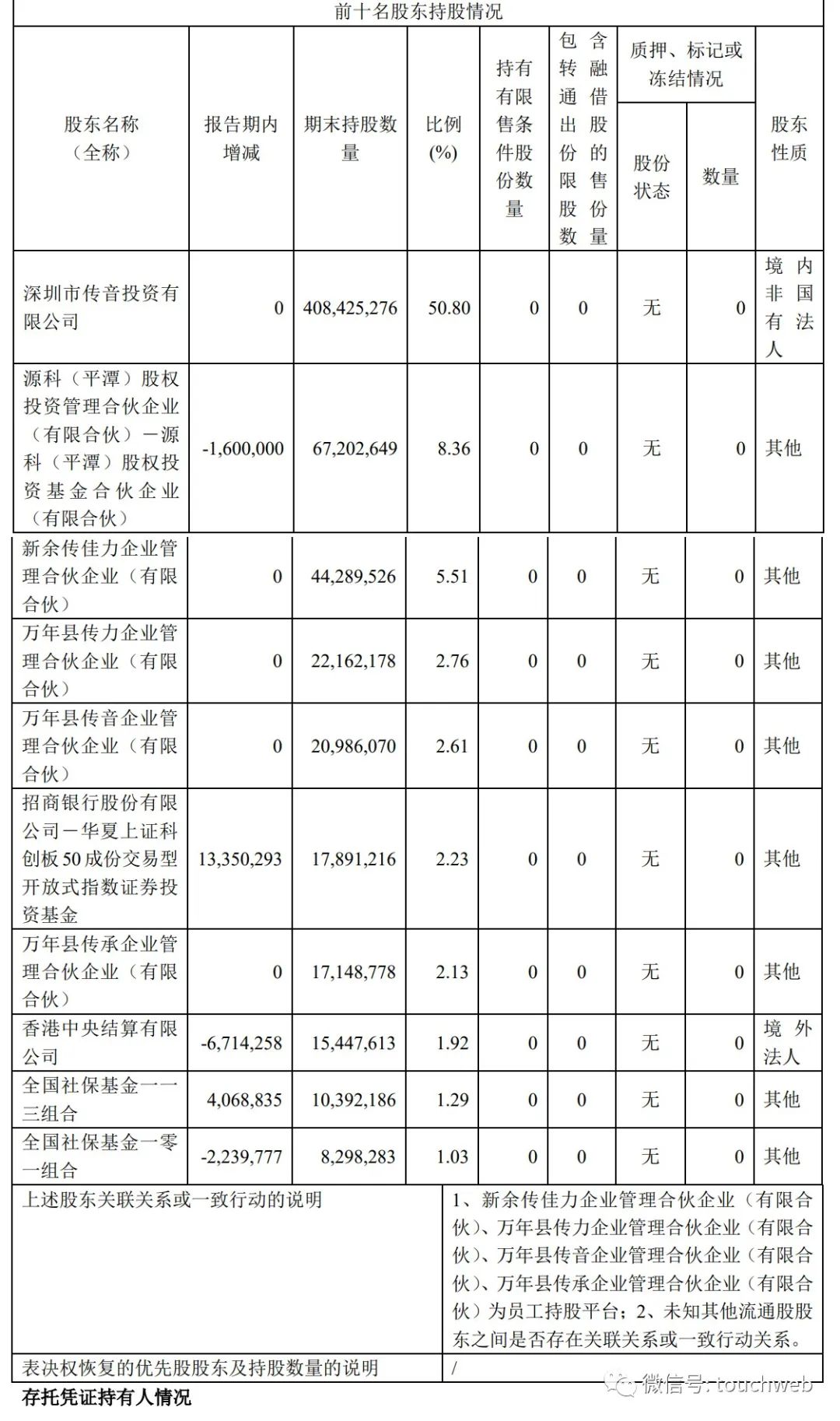 新余传佳力企业管理合伙企业(有限合伙)持股为5.51%,万年县传力企业管理合伙企业(有限合伙)持股为2.76%,万年县传音企业管理合伙企业(有限合伙)持股为2.61%,招商银行股份有限公司-华夏上证科创板50成份交易型开放式指数证券投资基金持股为2.23%;
