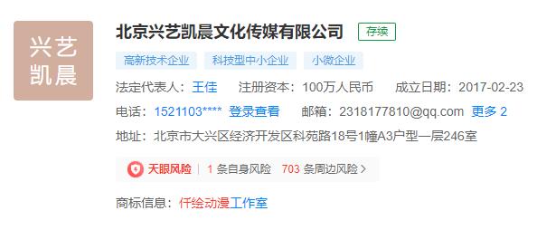 天眼查显示,“仟绘动漫”的商标,由北京兴艺凯晨文化传媒有限公司注册于2017年,现已失效,仟绘动漫工作室的微博也已停更。