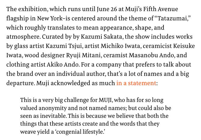 MUJI很喜欢拉着艺术家们一起互动(段落大意:纽约第五大道的MUJI旗舰店将开展一个关于Tatazumai的展览,将会有若干艺术家出席)