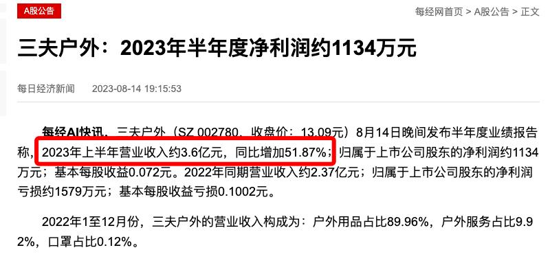 举个例子:三夫户外,这家公司是国内知名的户外/运动产品生产商,旗下的始祖鸟品牌,一件冲锋衣5000起步是常态。前几天他们的半年业绩报告显示:2023年上半年营业收入约3.6亿元,同比增加51.87%;去年双十一的时候,天猫上卖的始祖鸟羽绒服第一时间就被抢空。