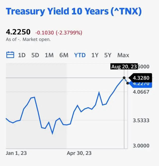 苹果公司被高估的第二个原因是当前美国的经济环境。国债利率处于十多年来的最高水平。因此,上个月市场出现了很大的波动,尤其是房地产行业。此外,纳斯达克指数在过去 6 个月内下跌了 7% 以上,而苹果同期上涨了近 20%,它们的估值被高估了。当经济存在很多不确定性时,许多投资者会选择将资金投入苹果公司或微软金融公司等避险股票,从而将它们推向估值过高的区域。