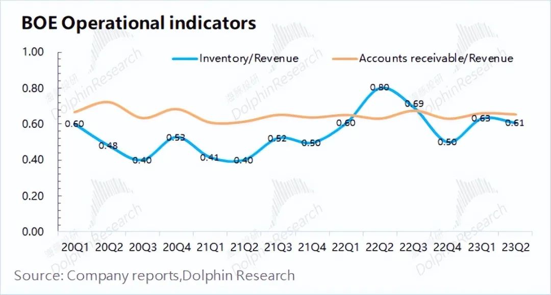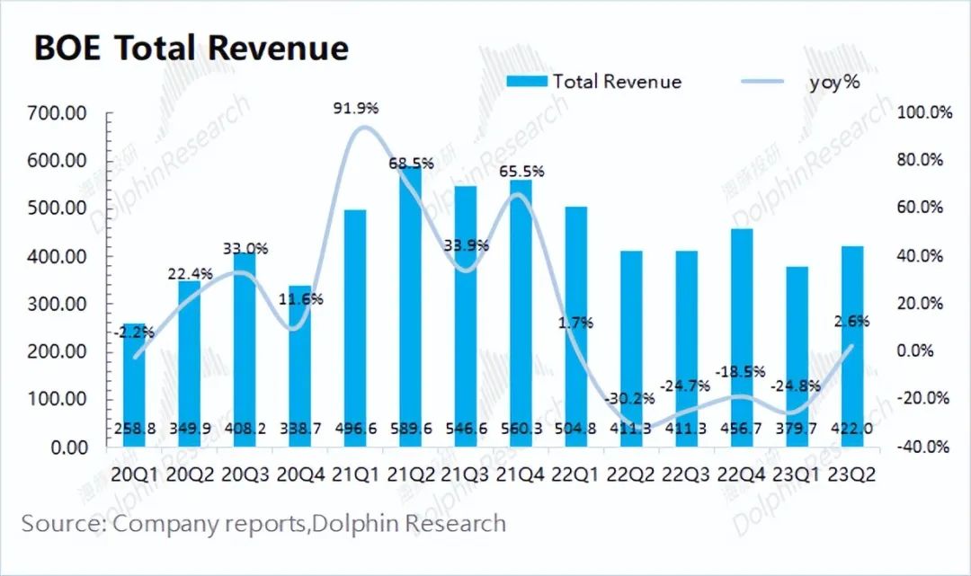 其中京东方在2023年第二季度总营收422亿元,同比增长2.6%。虽然公司二季度营收开始止跌回升,但仍低于市场预期(445亿元)。