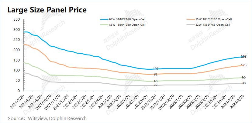 从Witsview 的8月下旬报价来看,65寸/55寸/43寸/32寸价格分别为168美金/125美金/66美金/38美金。各尺寸面板价格,已经从底部上涨有40%以上。