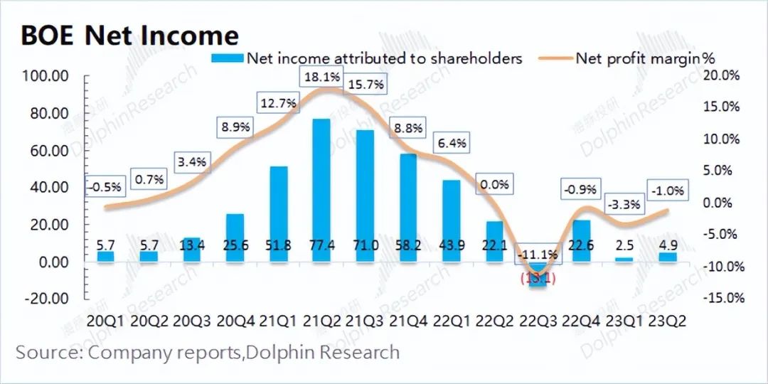 京东方在2023年上半年实现归母净利润7.35亿元,同比下滑88.9%。归母净利润能为正数,主要是通过少数股东权益带来。若只考虑净利润,京东方上半年出现16.67亿元的亏损。