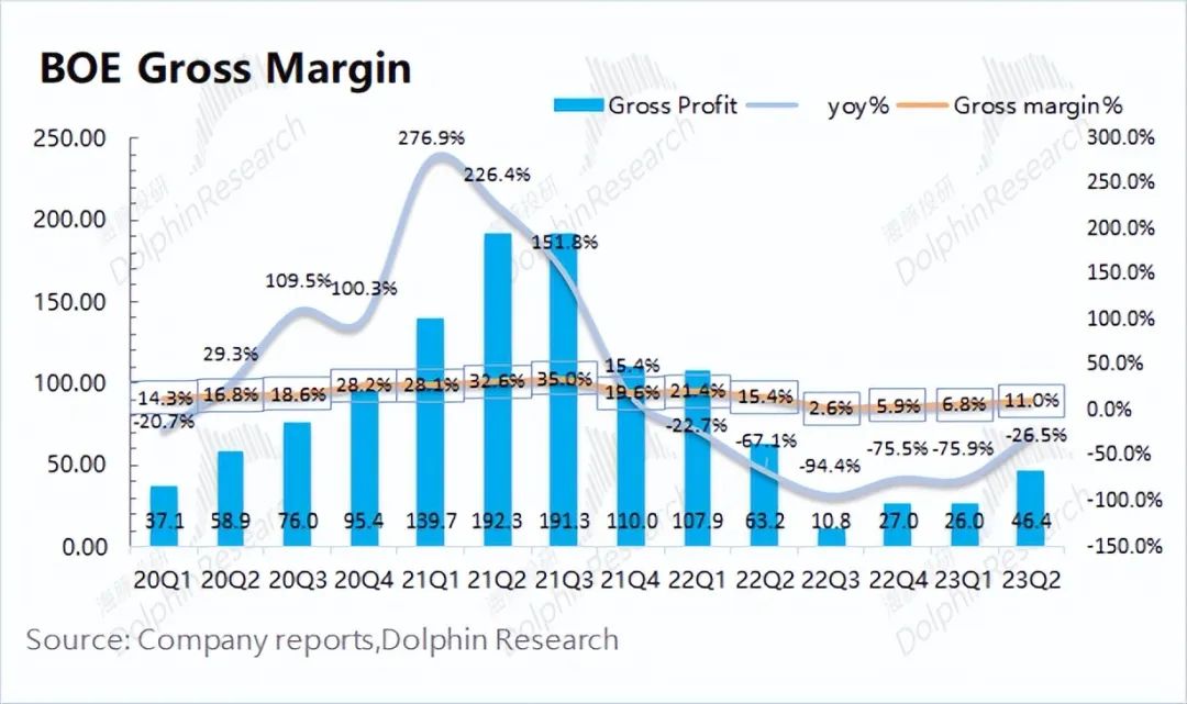 京东方在2023年上半年实现毛利72.43亿元,同比下滑57.7%。毛利的跌幅更是远远超过收入的下跌,这主要是价格下滑导致毛利率受挤压。
