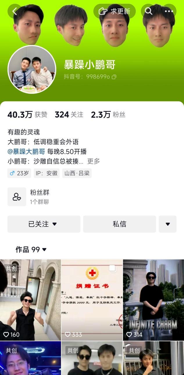因此,"暴躁小鹏哥""狂野的二宝"两位用户,靠着对小杨哥的模仿,很快弥补了平台空白,在视频号获得了不少粉丝;其中,主播"暴躁小鹏哥",在抖音也有同名账号,发布作品99部,但粉丝数仅为2.3万,流量表现远不如微信视频号。