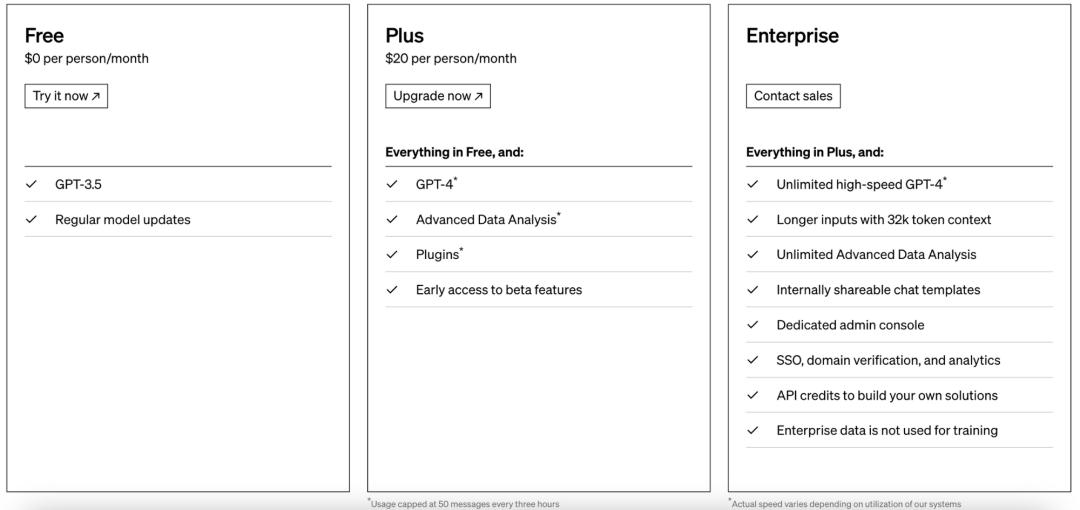 图为ChatGPT免费版、Plus版和企业版对比,来源:OpenAI