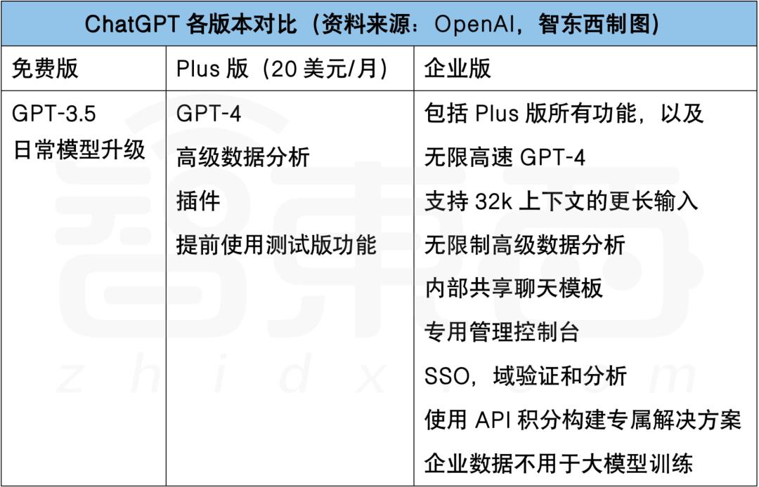 图为ChatGPT免费版、Plus版和企业版对比,智东西制图