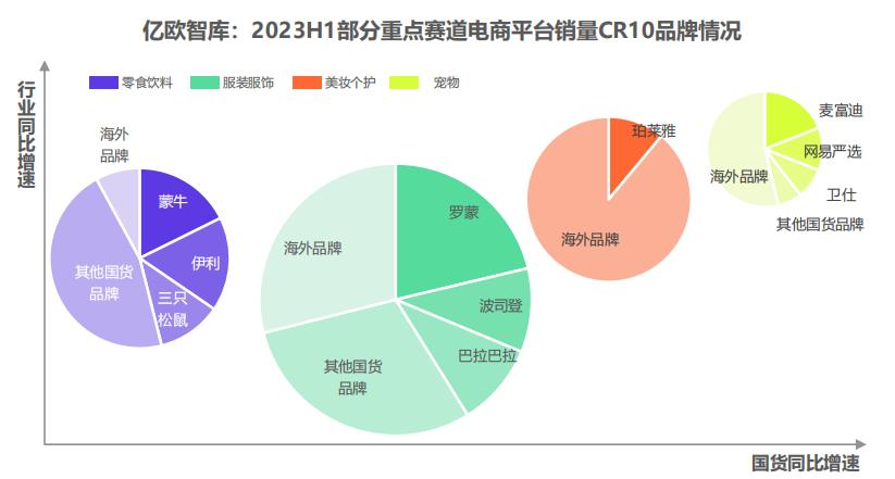 服饰鞋包、美妆、食品饮料、个护家清等重点行业仍是国货消费热门领域。2023H1服装服饰线上销售额达3871亿,美妆个护与零食饮料的线上销售额也分别达1965亿和1572亿,同比均在7%左右,保持稳中有升的态势。
