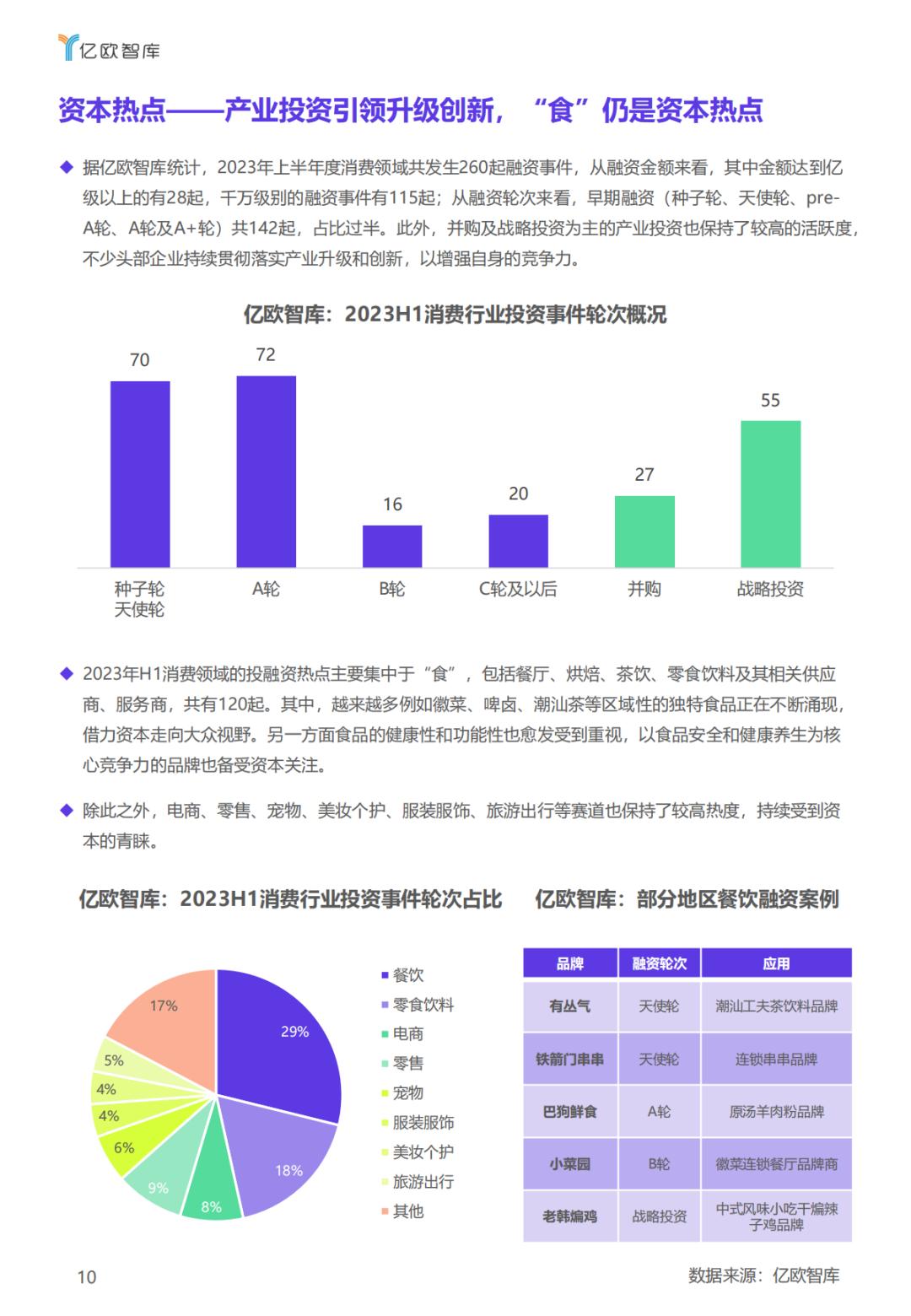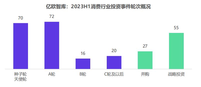据亿欧智库统计,2023年上半年度消费领域共发生260起融资事件,从融资金额来看,其中金额达到亿级以上的有28起,千万级别的融资事件有115起;从融资轮次来看,早期融资(种子轮、天使轮、pre-A轮、A轮及A+轮)共142起,占比过半。此外,并购及战略投资为主的产业投资也保持了较高的活跃度,不少头部企业持续贯彻落实产业升级和创新,以增强自身的竞争力。