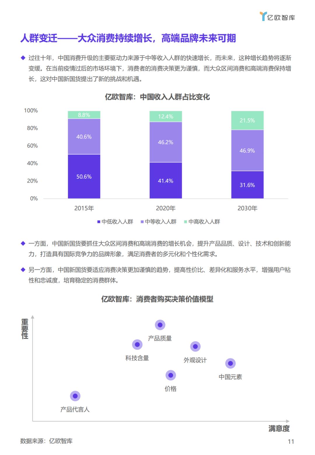 过往十年,中国消费升级的主要驱动力来源于中等收入人群的快速增长,而未来,这种增长趋势将逐渐变缓。在当前疫情过后的市场环境下,消费者的消费决策更为谨慎,而大众区间消费和高端消费保持增长,这对中国新国货提出了新的挑战和机遇。