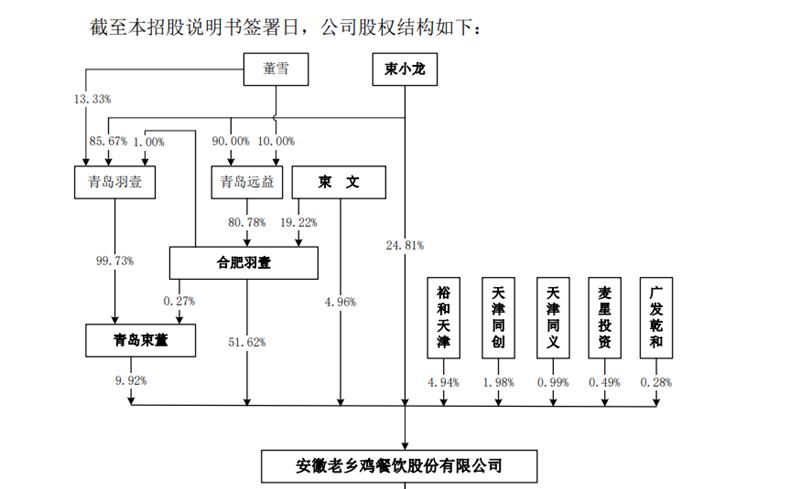根据老乡鸡招股书显示,束从轩、妻子张琼、儿子束小龙、儿媳董雪、女儿束文,5名家族成员为公司实际控制人。创始人束从轩担任董事长,其子束小龙担任副董事长、儿媳董雪担任董事和副总经理,二人与束从轩女儿束文通过合肥羽壹、青岛束董合计持有老乡鸡61.55%的股权,另外束小龙和束文合计直接持股29.77%,三人共持有老乡鸡91.32%的股份。