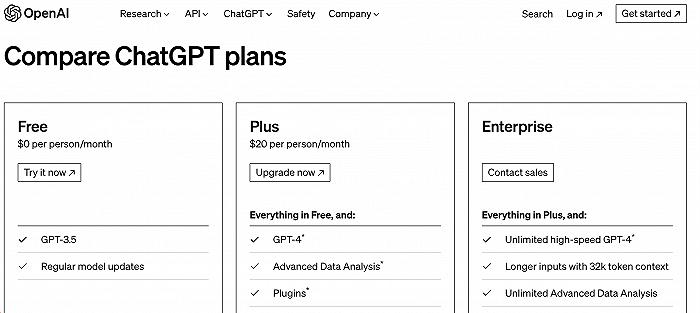 到今天为止,ChatGPT已拥有免费版、Plus版(每月20美元)和企业版三个订阅方案,企业版可视为对前两者功能上的一种补足。