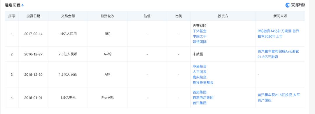 图/首汽租车融资历程 来源/天眼查 极派Daily截图