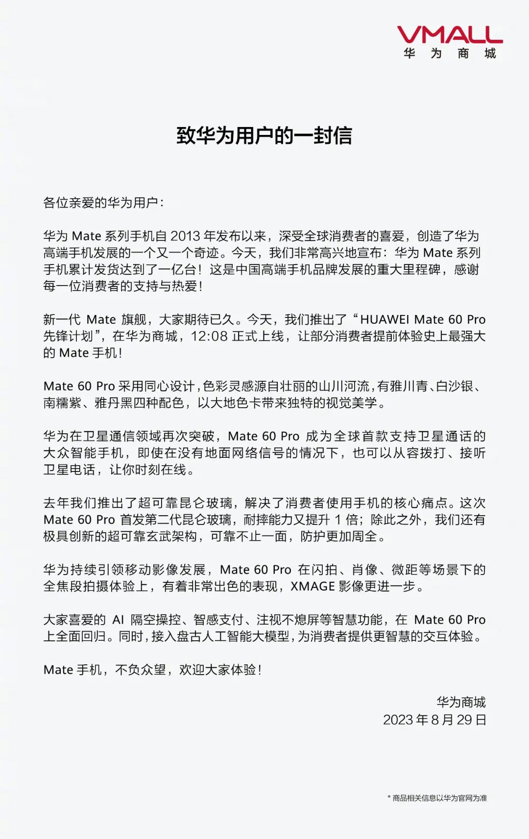 除了商店里显示的外观、价格和配置信息以外,华为只通过一封公开信的方式对新手机进行了介绍。