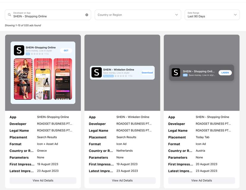 再以 SHEIN 为例,我们看到在各个国家的广告投放情况,如下图: