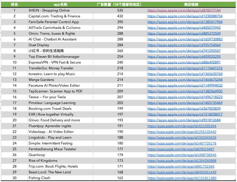 常见的 App 的广告资源如下图所示,这里可以看到我们出海欧洲的主力军,如 SHEIN 等。