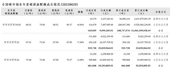 8月29日,全国碳市场碳配额挂牌协议交易收盘价为69.18元/吨,下跌5.92%,止住了持续一个月的涨势。