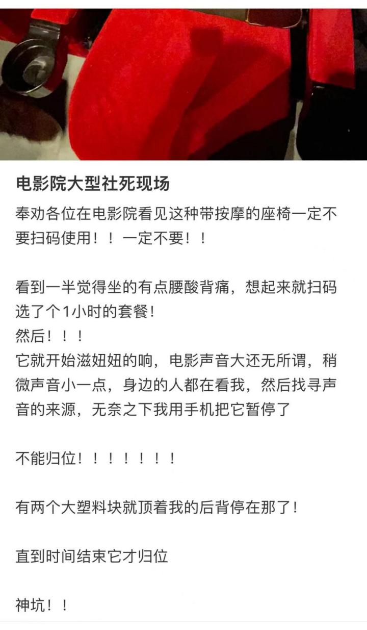 “影院按摩椅真是反人类啊”“看电影被这椅子折磨得痛到想站起来和它对打”“启动很吓人,中途不能停,关键不舒服”等类似吐槽在相关话题评论区里并不少见。