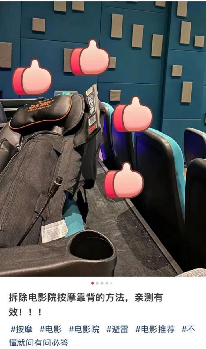 其次,是优化影院共享按摩椅的使用操作。不难发现,如果座位旁边铺设有按摩椅,椅子扶手上亮着荧光的二维码将会成为整个影厅“最显眼的存在”。而按摩椅运作时发出的嗡嗡声和功能零件运作时的咯吱声,也会严重影响到周围的观众,常常让用户感到“社死”。