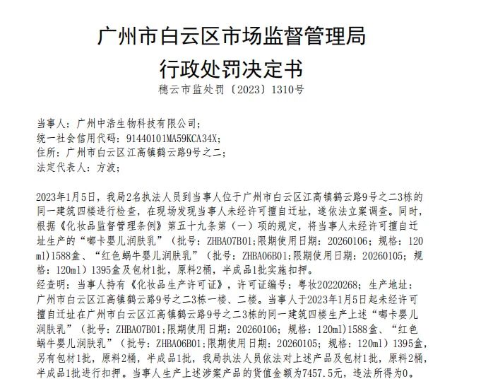 经白云区市监局调查,广州中浩所持有的《化妆品生产许可证》的许可证编号为“粤妆20220268”,生产地址为“广州市白云区江高镇鹤云路9号之二3栋一楼、二楼”,而该公司于2023年1月5日起,未经许可擅自迁址在广州市白云区江高镇鹤云路9号之二3栋的同一建筑四楼生产了上述涉案产品。