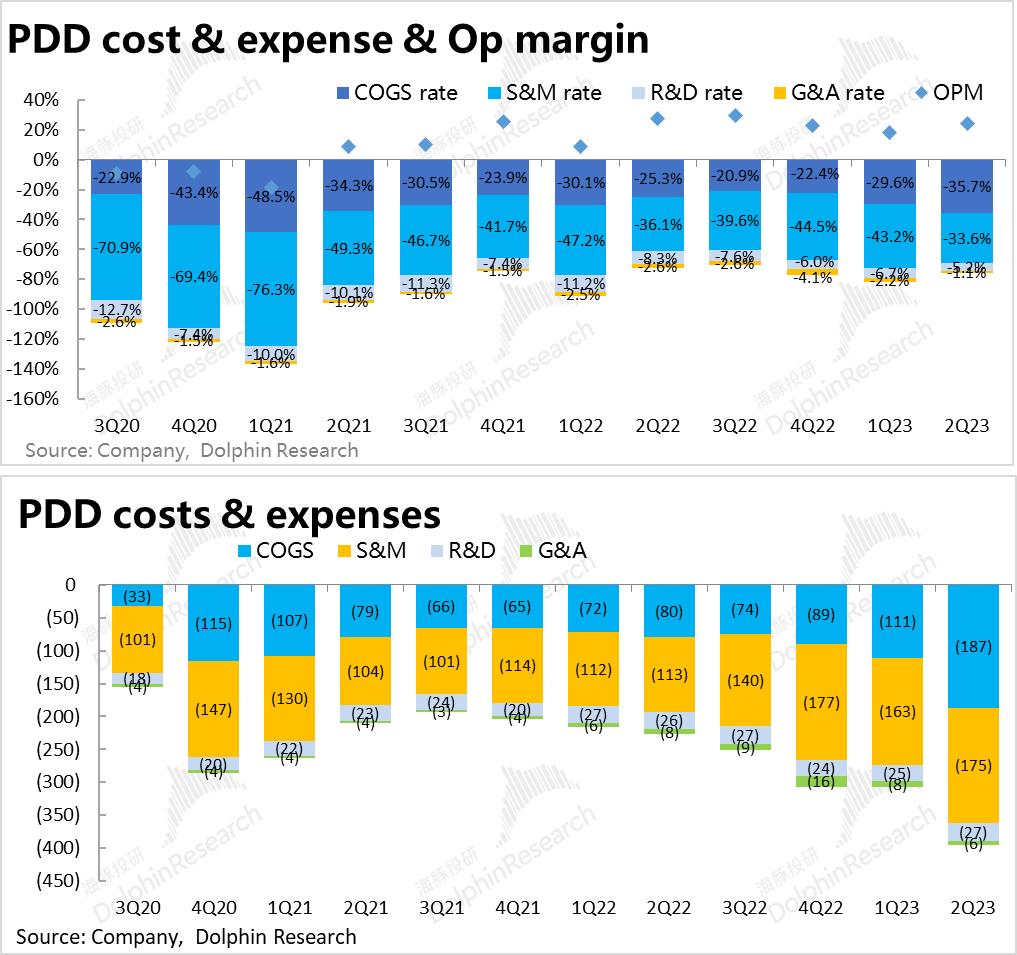 本季度拼多多的营销费用为175.4亿,虽然看似高于预期,但实际环比仅增加了不到13亿(相比之下京东的2Q营销投入则环比增加了近44亿)。考虑到二季度618大促季的季节性差异,且Temu规模环比成倍增长所需的营销投入势必也非常可观,海豚君认为,拼多多营销费用的增长相比之下反而是最少的,表明竞争并未导致拼多多被迫增加商城主业的推广或补贴。