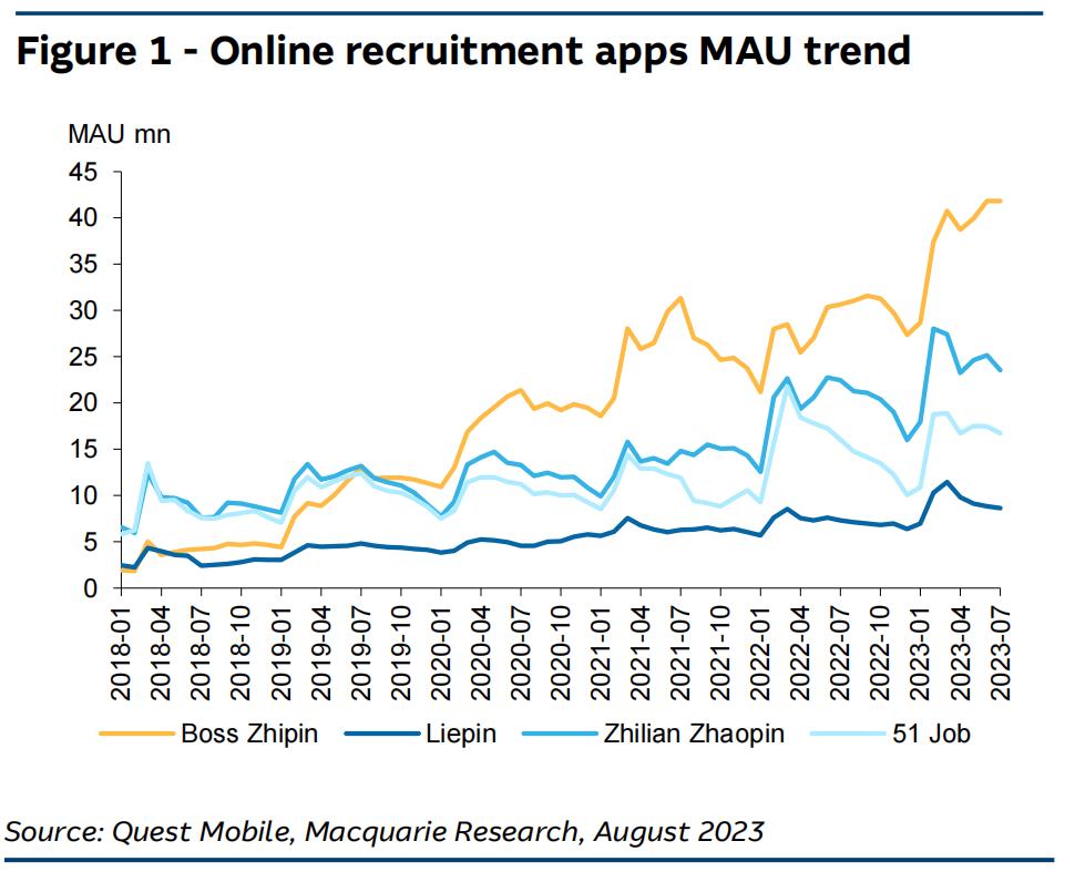 (1)比如公司在一季度业绩披露后的交流中,透露当时4、5月度情况虽然在环比好转中,但后续还是有比较多的不确定性。其中今年以来的增量主要还是中小企业,KA大企业招聘需求恢复得较慢,而KA企业在2022年的收入贡献超过1/3,因此虽然Q1业绩不算差,但因为预期未有改善,股价反而继续走弱。而当7月重点会议开完,宏观预期好转,BOSS直聘也来了一波小行情。