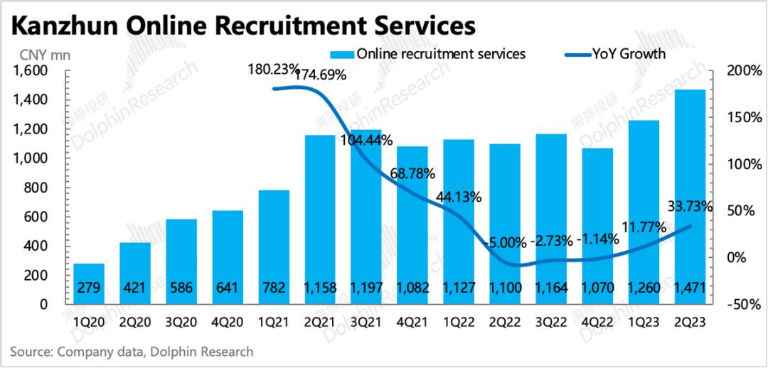 招聘平台的金主是企业方,BOSS直聘上网络招聘收入也是占比98.9%,因此总收入增速跟着企业付费来,二季度在低基数下加速增长。
