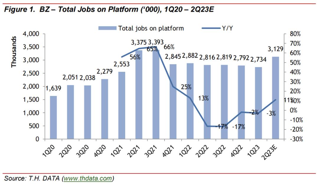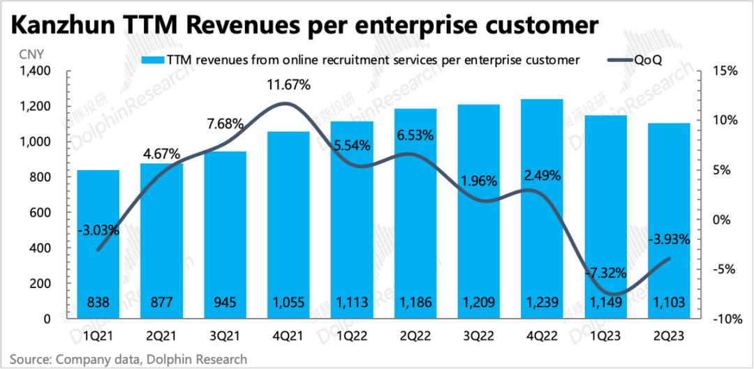 (2)因此对应到当下来看,Q2的业绩说明的问题其实和Q1类似,即宏观压力下,就业市场失衡,一方面增多粥少求职者源源不断,另一方面企业也有控费需求,因此对招聘的付费动力不足。