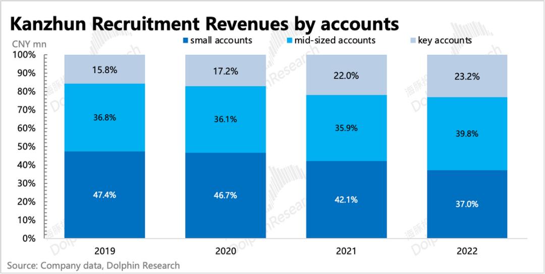 但对于BOSS直聘来说,虽然中小企业的收入贡献在逐年提升,但2022年占比仍有1/3的KA企业客户,他们的需求回暖节奏仍然对收入或者是现金流水有很大影响。