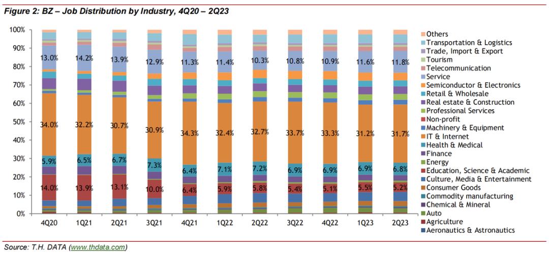 从另类数据来看,二季度招聘职位发布数同比、环比也大幅增长,值得一提的是,互联网IT等企业的发布需求开始环比回暖。