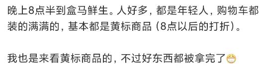 “每晚8:00一到,如同天神降临一般的盒马促销员,就会准时贴上打折价签,敞开大门拥抱等待这一刻的人。”