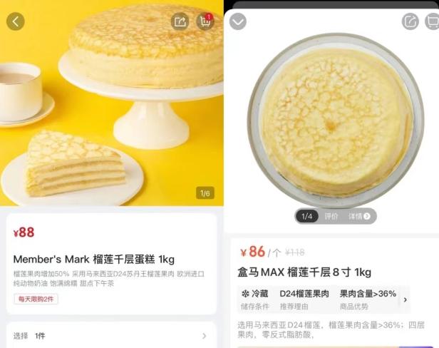盒马率先将榴莲千层标价到99元一块,山姆紧随其后把榴莲千层的价格打到了88元。
