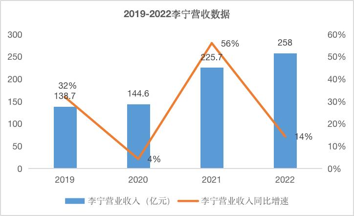 积极投入咖啡和快闪店布局的李宁,财务数据也并不好看。2021年,短暂剥离了疫情的影响后,触底反弹的李宁在当年实现225.7亿元营收,同比增长56%。然而,到了2022年,其增速明显放缓至14%,是近四年除了疫情爆发当年以外,增速最慢的一年。