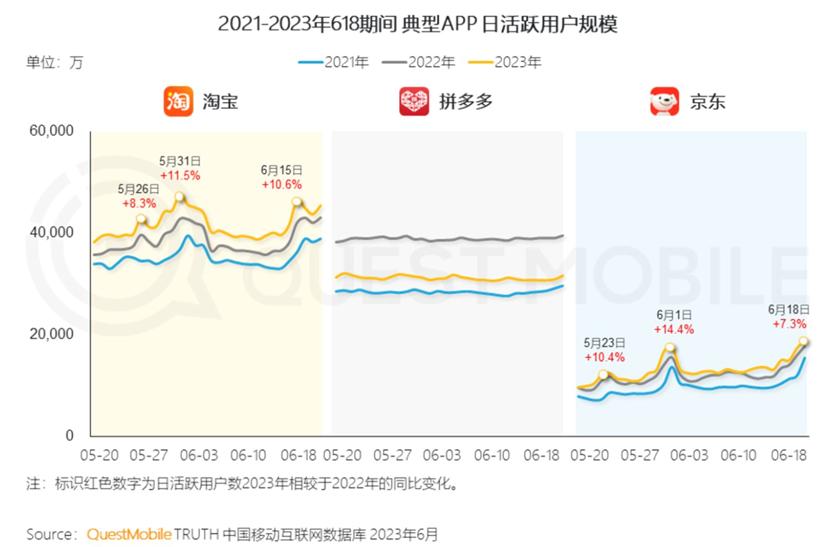 QuestMobile数据显示,2022年2月,拼多多日活用户超过3.55亿,超越手机淘宝,并在之后的12个月里保持领先;2023年3月,拼多多被手淘反超。2023年618期间,拼多多与淘宝日活用户规模差距较去年同期拉大。