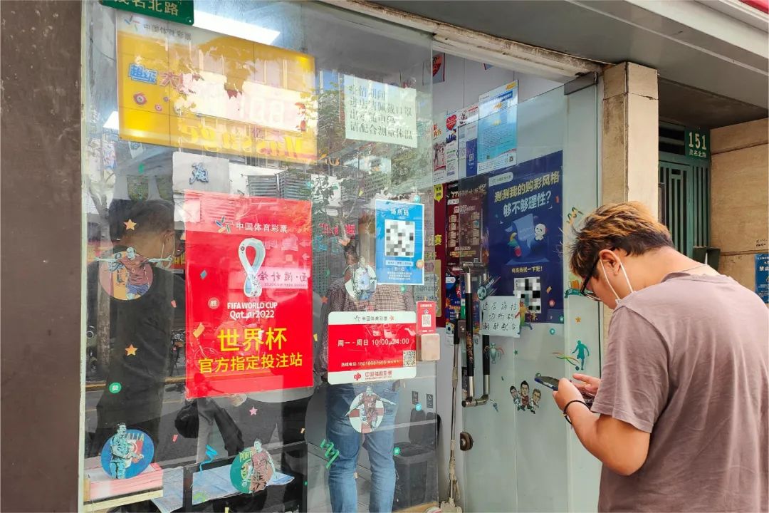 卡塔尔世界杯期间,上海静安区一体育彩票站点内排起队伍。