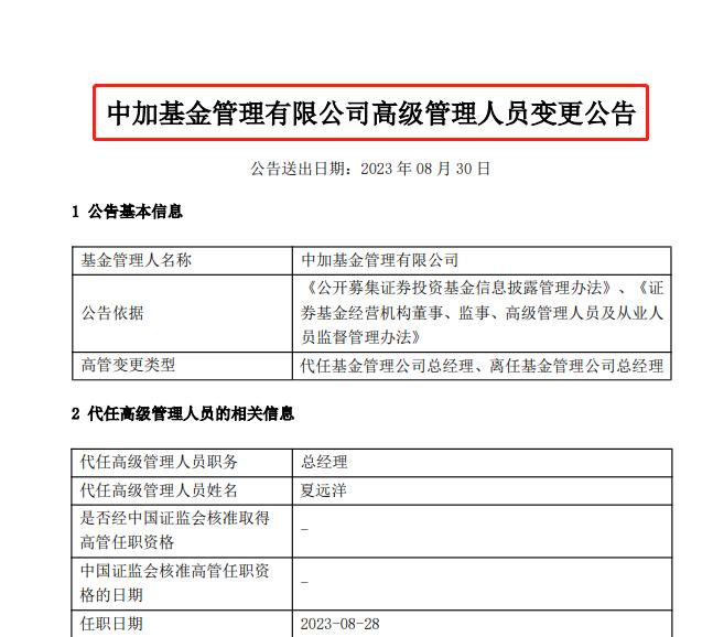 8月30日,中加基金发布公告称,公司原总经理宗喆已于8月28日离任,由今年3月履新董事长的夏远洋代任公司总经理。